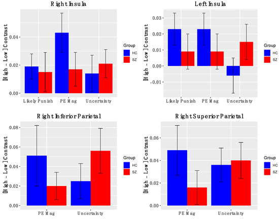 BOLD activation of Salience Nodes to fMRI contrasts: Error bars represent standard error of the mean; HC—healthy control; SZ—schizophrenia.