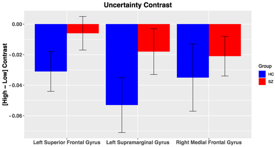 DMN Nodes. Across all participants, multiple ROIs within the DMN were reliably deactivated for the uncertainty contrast, including the left supramarginal gyrus (Figure 5; t(50) = −2.9, p = 0.005, right medial frontal gyrus (t(50) = −2.2, p = 0.03), and left superior frontal gyrus (t(50) = −2.05, p = 0.046). No other significant effects were noted within the DMN for the other salience contrasts (i.e., PE valence, PE magnitude, likely reward omission). Furthermore, we did not observe significant differences in BOLD activation of DMN nodes to our various salience contrasts between groups, potentially due to high variability in BOLD activation. In the reduced sample, group differences for DMN nodes were in a similar direction but did not reach significance (Supplementary Materials, Figure S4).