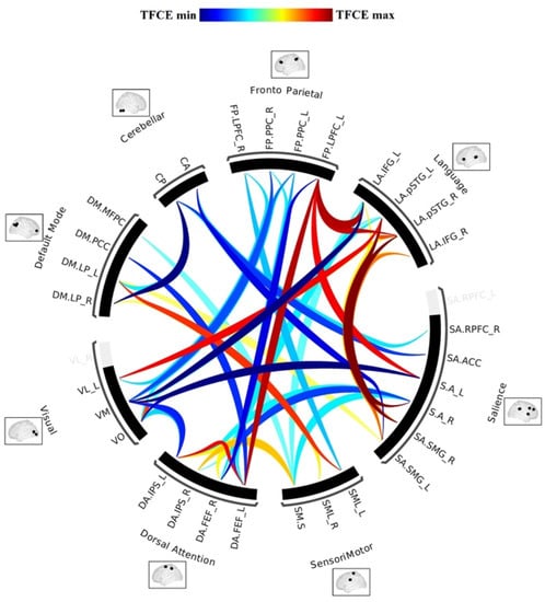 Single-subject and group rest-fMRI analysis for the commonly used functional networks, can be performed and graphically displayed as a circular graph named “connectome” (Figure 2) [5,47].