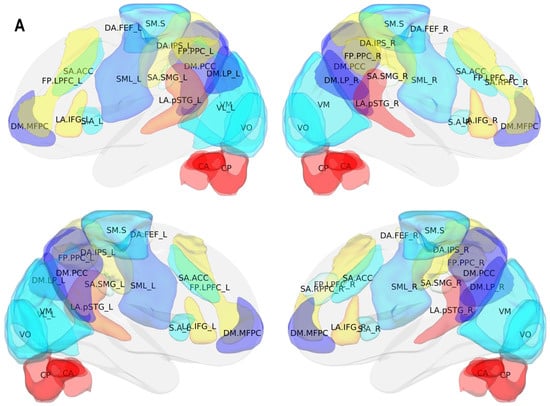 - Wang, D.; Buckner, R.L.; Fox, M.D.; Holt, D.J.; Holmes, A.J.; Stoecklein, S.; Langs, G.; Pan, R.; Qian, T.; Li, K.; et al. Parcellating cortical functional networks in individuals. Nat. Neurosci. 2015, 18, 1853–1860. [Google Scholar] [CrossRef] [Green Version]