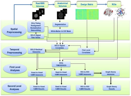 Therefore, the graph theory analysis shows the relation between the nodes and edges and describes these interactions through different graph parameters (e.g., clustering coefficient). Using these analysis methods for functional connectivity, different RSNs in the brain can be identified, such as the salience network, auditory network, basal ganglia network, higher visual network, visuospatial network, default mode network, language network, executive network, precuneus network, primary visual network, and sensory-motor network. Importantly, for rest-fMRI image processing, a variety of different post-processing software packages can be used, mainly freely available as open-sources, such as Statistical Parametric Mapping (SPM Available online: https://www.fil.ion.ucl.ac.uk/spm/ (accessed on 1 September 2021)), FSL (Available online: https://fsl.fmrib.ox.ac.uk/fsl/fslwiki (accessed on 1 September 2021)), Analysis of Functional NeuroImages (AFNI Available online: https://afni.nimh.nih.gov/ (accessed on 1 September 2021)), and CONN toolbox (Available online: https://web.conn-toolbox.org/ (accessed on 1 September 2021)). However, these software require a high knowledge and expertise to conduct postprocessing analysis as they lack standardization, thus requiring ad hoc adjustments or custom-made scripts to tailor the postprocessing pipeline.
