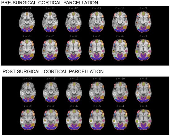 Cortical parcellation obtained before and after surgical resection of brain glioma.