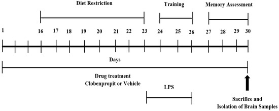 Timeline administration of drug, behavioral assessments, and isolation of brain samples. The groups of the mice were administered vehicle or clobenpropit (1 or 3 mg/kg) orally for 30 days. Except for the control, other groups were injected with four doses of LPS (250 μg/kg, i.p.) to induce neuroinflammation (days 23–26). Regarding RAM assessments, the training sessions were conducted from days 24 to 26. The memory assessments were analyzed from days 27 to 30. At the end of the memory assessments, on day 30, all the animals were sacrificed and brain tissues were collected for ELISA tests.