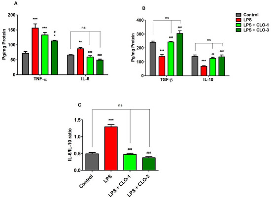 Effect of clobenpropit (CLO) on (A) pro-inflammatory cytokines (TNF-α and IL-6), (B) anti-inflammatory cytokines (TGF-β and IL-10), and (C) IL-6/IL-10 ratio in lipopolysaccharide (LPS)-induced mice brains. LPS-CLO-1 and LPS-CLO-3 refer to the administration of clobenpropit (1 or 3 mg/kg, p.o, respectively) and lipopolysaccharides (250 μg/kg, i.p.). Administration of LPS resulted in the elevation of pro-inflammatory cytokines and reduction of anti-inflammatory cytokine activities. Interestingly, the CLO treatment attenuated the inflammatory activity of LPS. The ratio of IL-6/IL-10 also lowered with CLO treatment in LPS-challenged mice. The results are expressed as mean ± SEM (n = 6). One-way ANOVA (F(3,20) = 16.68, p < 0.001 for TNF-α and F(3,20) = 20.96, p < 0.001 for IL-6) (F(3,20) = 26.33, p < 0.001 for TGF-β and F(3,20) = 11.18, p < 0.001 for IL-10) (F(3,20) = 88.18, p < 0.001 for IL-6/IL-10 ratio) was followed by Tukey–Kramer multiple comparisons tests. * p < 0.05, ** p < 0.01 and *** p < 0.001 as compared to the control group; ns, not significant as compared to the control group; # p < 0.05, ## p < 0.01 and ### p < 0.001 as compared to the LPS-treated group.