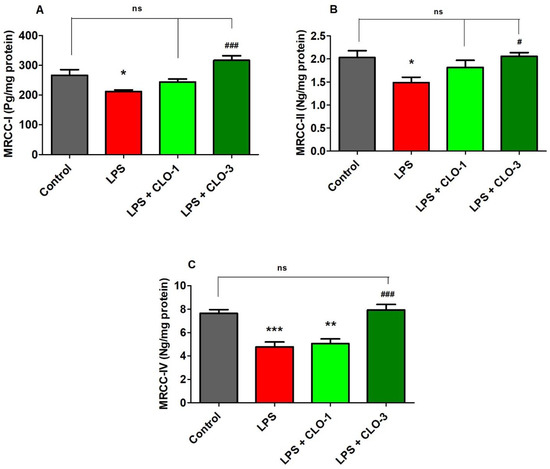 Results from MRCC-II activity (Figure 5B), when compared among the groups, show that there were significant changes in MRCC-II activity (F(3,20) = 4.270, p < 0.05) among the groups in mice brains. Furthermore, administration of LPS caused a considerable decrease in MRCC-II activity as related to control animals. Similarly, the higher dose of CLO (3 mg/kg, p.o.) significantly improved the brain MRCC-II activity (p < 0.05) that was decreased by injections of LPS. At a low dose of CLO (1 mg/kg, p.o.), no alteration in the level of brain MRCC-II activity resulted as compared to LPS-treated mice.