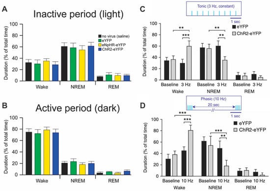 Effects of LC activation patterns on sleep-wake arousal. (A,B) reflect the normal percentages of awake, non-REM (non-rapid eye movement) sleep and REM (rapid eye movement) sleep over a one-hour sample in the inactive (A) or active (B) period of the light-dark cycle. The expression of light-sensitive inhibitory and excitatory channels did not alter the sleep-wake patterns relative to controls. (C,D) reflect the changes in duration of wake, non-REM and REM sleep when mice were given 1 h of bilateral tonic 3 Hz (C) or phasic 0.5 s/20 s activation (D) in the inactive period. ** p < 0.01 *** p < 0.001. Reprinted with permission from [11] 2010 Springer Nature BV.