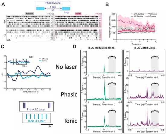 Phasic LC activation produces novelty-related memory extension and mimics sensory salience. (A) Ventral tegmental area (VTA) neurons and locus coeruleus (LC) neurons firing in a familiar versus novel environment are shown. Corresponding raster lines in the two settings are the same unit sampled for 1 min. The cartoon shows the phasic optogenetic pattern used to mimic novel environment firing of LC neurons. (B) The average of 15 neurons from 5 mice over the 5 min period in the two environments. LC units show habituation in firing rate. Reprinted from [30] 2016 Springer Nature BV. (C) Averaged event related potentials (ERP; n = 50 events) from the medial prefrontal cortex. Response times locked to phasic LC onset show N1- and P3-like components not seen with the tonic LC pattern. Cartoons show phasic and tonic patterns matched for number over 1 s. (D) Hindlimb evoked responses to a weak shock without LC photoactivation, with phasic LC photoactivation and with tonic LC photoactivation. Green lines represent early latency hindlimb responses that were always present to shock but were modulated by concurrent LC activation. Purple lines represent early and longer latency responses that were seen in nearby somatosensory neuron populations only when LC was concurrently activated (LC gated units). Adapted with permission from [31] 2018 PNAS.