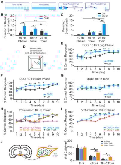 Phasic, but not tonic, LC activation improves odor discrimination learning via selective VTA activation. (A) The four blue light pulse patterns used to activate LC neurons. (B) Increases in rearing duration during a 10 min open field test with 10 Hz phasic or 10 Hz tonic LC activation relative to controls. (C) Increase in open field freezing behavior with 25 Hz tonic LC activation. (D) The odor discrimination task with blue light activation. The rat was discriminating two odors (octanol and heptanol in a 60:40 versus a 50:50 mixture; 0.001% concentration) for a cereal reward. (E) Ten pulses @ 10 Hz/30 s (long phasic) resulted in rats reaching criterion on Day 3 rather than Day 8. (F) Three pulses @ 10 Hz/2 s (brief phasic) also resulted in rats reaching criterion on Day 3. (G) Ten Hz tonic light activation did not enhance acquisition. (H) A dopamine-receptor antagonist in olfactory cortex (piriform cortex) prevents the phasic light-mediated learning acceleration but not the final discrimination. An adrenoceptor antagonist cocktail in the piriform cortex prevents acquisition of the difficult odor discrimination. (I) Lidocaine infusion in the ventral tegmental area (VTA) prevents the acceleration of odor discrimination acquisition but not discrimination itself. (J) c-Fos examination of VTA reveals similar numbers of VTA dopaminergic neurons (TH+) examined across groups. c-Fos activation by odor + LC light differs from no light controls with the 10 Hz phasic pattern, but not with the tonic 10 Hz pattern. Dopaminergic neurons of VTA are significantly more activated by odor + phasic LC activation. * p < 0.05; ** p < 0.01. Adapted with permission from [13] 2021 Creative Commons Attribution-Non-Commercial 4.0 International Public License (CC BY-NC 4.0).