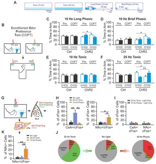 Phasic and tonic LC activations lead to differential valence odor learning. (A) The four blue light pulse patterns used to activate LC neurons. (B) Schematic for conditioned odor preference protocol. (C) A conditioned odor preference following odor pairing with long phasic LC (10 Hz for 10 s/30 s) (D) A conditioned odor preference following odor pairing with brief phasic LC (10 Hz for 300 ms/2 s). (E) No preference effect when pairing odor with 10 Hz tonic LC activation. (F) A conditioned odor aversion following odor pairing with 25 Hz tonic LC activation. (G). The protocol used for c-Fos studies. (H) The central amygdala (CeA) projecting neurons in the basolateral nucleus of the amygdala (BLA) were significantly activated by 25 Hz tonic LC activation paired with odor relative to no light and brief phasic LC activation controls. BLA neurons projecting to the nucleus accumbens (NAc) showed significant c-Fos activation relative to no light and 25 Hz tonic controls when odor was paired with phasic LC activation by 3 pulses of 10 Hz light/2 s for 10 min. (I) If only the phasic or tonic LC activation was given for the same period without a novel odor present, there was no difference in c-Fos neurons activated by the two patterns and relatively few c-Fos neurons were observed. (J) Pie charts showing the proportion of CEA (green) and NAc (red) projecting neurons as a fraction of the total set of c-Fos neurons (grey + green + red) observed in BLA with 25 Hz LC tonic + odor, no light + odor, and brief 10 Hz phasic LC + odor. (K) NAc-projecting neurons in VTA showed increased c-Fos with brief 10 Hz phasic LC + odor relative to no light + odor and 25 Hz LC tonic + odor groups. * p < 0.05; ** p < 0.01. Adapted with permission from [13] 2021 Creative Commons Attribution-Non-Commercial 4.0 International Public License (CC BY-NC 4.0).