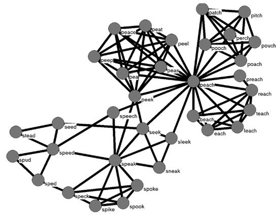 The results of a number of behavioral experiments using conventional psycholinguistic tasks in laboratory settings have shown that certain network structures at various scales of the phonological network influence the production, recognition, and learning of spoken words in English. For example, the experiments in [18] considered a micro-scale measure, the (local) clustering coefficient, and how it influenced spoken word recognition (see also [19,20,21,22]). At the macro-scale, experiments by [23] examined how the location of words in the giant component (i.e., the largest group of connected nodes in a network) or in “lexical islands” (i.e., smaller groups of words that are connected to each other, but not to words in the giant component) of the phonological network influenced spoken word recognition. Finally, at the meso-scale, [24] found that a set of words in key positions, whose removal would disconnect the network, tended to be recognized more quickly than foil words that were similar to the keywords in a variety of lexical characteristics.