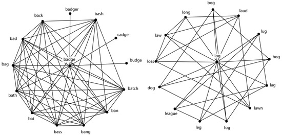 The first study to demonstrate that one of the network structures observed in [14] influenced the performance of humans in a conventional psycholinguistic task was reported in [18]. In that study it was observed that the micro-scale measure known as the (local) clustering coefficient influenced the accurate identification of words presented in noise in a perceptual identification task. Informally and in the context of a phonological network, the local clustering coefficient refers to the extent to which phonological neighbors of a given word are also neighbors of each other (see [18] and others for a more formal definition of clustering coefficient). As seen in Figure 2, the words badge and log in the middle of the two networks represent the target words, with the same number of phonological neighbors encircling each target word. The word badge has a higher clustering coefficient than the word log, because the phonological neighbors of badge tend to be neighbors of each other to a greater extent than the phonological neighbors of log.