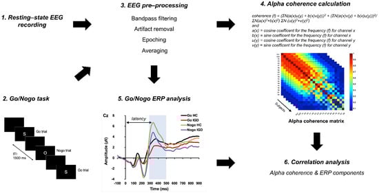 Over the last four decades, numerous studies have employed electroencephalography (EEG) to investigate the characteristics of addictive disorders. Resting-state EEG does not require active tasks, and EEG coherence is a useful tool for the diagnosis and treatment of diseases because it provides information on functional brain connectivity based on the coupling between two neuronal populations. EEG coherence analysis is a linear measure of the pairwise correlations of power spectra in the time domain between two electrode signals []. In this regard, a higher EEG coherence value indicates higher synchronization or intensive communication between neuronal populations []. A study reported that alpha coherence in the right hemisphere was higher in IGD patients with low resilience than in IGD patients with high resilience and healthy controls (HCs) []. A study on adolescents reported that compared to patients with attention deficit hyperactivity disorder (ADHD) only and HCs, patients with co-morbid ADHD and IGD had higher intra-hemispheric coherence in right parieto-occipital electrode sites at delta, theta, alpha, and beta frequencies []. Event-related potentials (ERPs) provide a wealth of information on brain function and have been harnessed extensively in the fields of neuroscience and psychiatry. Go/Nogo tasks have been employed to investigate the neurobiological mechanisms underlying inhibitory control and various cognitive functions [,]. A study using the Go/Nogo task reported that IGD patients exhibited delayed Nogo-N2 latency in the central area compared to HCs, which may reflect impaired response inhibition in IGD. Delayed latency has also been associated with IGD severity scores and impulsivity []. A source localization study conducted using the Go/Nogo task reported that patients with IGD exhibited reduced neuronal activity in the anterior cingulate cortex (ACC) and dysfunctional error-processing, entailing poor inhibition and decision-making [].