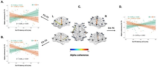 In this study, we investigated group differences in the correlations between resting-state EEG alpha coherence and Go/Nogo ERP components in participants with IGD and HCs. Notably, we identified significant group differences in the correlations between Go-P3 latency and alpha coherence of the left fronto-temporal and bilateral centro-temporal regions. In the HC group, positive correlations were observed between alpha coherence in the left fronto-temporal and bilateral centro-temporal areas and Go-P3 latency. Go-P3 reflects the subsequent processes of response inhibition related to stimulus evaluation or allocation of attentional resources []. P3 latency is considered an index of neural speed or brain efficiency [,]. In this regard, it is conceivable that HCs with high alpha coherence tended to adopt more cautious decision-making strategies, as reflected by the prolongation of P3, compared to HCs with low alpha coherence.