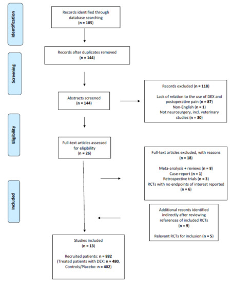 The outcomes of interest were procedural success and postoperative pain intensity rated on a Verbal- or Numeric Rating Scale (VRS/NRS) or a Visual Analogue Scale (VAS) during postoperative care, including the number of patients with moderate or severe pain (VRS/NRS > 4, VAS > 5). If pain intensity in the post-anaesthesia care unit (PACU) and the post-surgical ward was measured at several points in time, the highest pain score within the defined time period was registered. Procedural success was defined as completion of the specific neurosurgical operation without serious intra- or postoperative complications that caused patients to withdraw or be excluded from the study. Other outcomes of interest involved cumulative morphine/analgesic consumption, patients with DEX-related side effects (e.g., intra- or postoperative bradycardia, hypotension) and procedure-related outcomes (e.g., hypertension, tachycardia).
