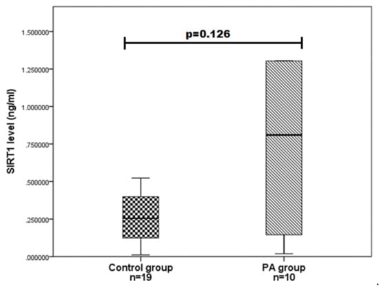 We evaluated SIRT1 serum levels in ten PA patients and 19 age and gender-matched control group subjects and determined that SIRT1 serum levels do not differ statistically significantly between the PA and control groups (0.810 (1.685) vs. 0.255 (0.293); p = 0.126) (Figure 1). We also compared the SIRT1 serum levels between different gender groups and found that women with PA have higher SIRT1 levels than control women (1.115 (3.748) vs. 136 (0.211); p = 0.008) (Figure 2). Any associations were found between the age of PA patients and SIRT1 concentrations.