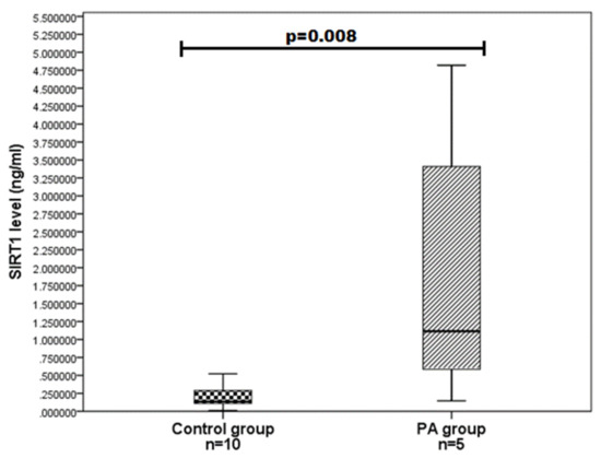 SIRT1 serum levels in PA and control groups. SIRT1 levels (ng/mL) in the PA patient serum versus controls are presented as box-and-whisker plots with the median and IQR. Mann–Whitney U test was used to assess the differences in SIRT1 concentration between PA patients and the control group.