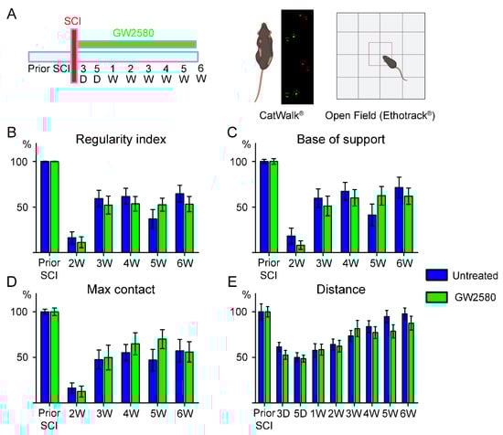 Recently, we have shown that transient (1 week) inhibition of microglia proliferation improves motor recovery after SCI [11]. To investigate whether prolonged inhibition of microglia proliferation further improves motor outcomes, we studied the effect of long-term (6 weeks) GW2580 treatment starting immediately after SCI (Figure 1A). We first compared motor function of uninjured vs. injured mice to verify that T9 lateral hemisection of the spinal cord induced a significant and quantifiable impact on motor activity using CatWalk (Supplementary Figure S1A–C) and open field (Supplementary Figure S1D). We then assessed motor recovery of hemisected mice (n = 28) over 6 weeks post-injury. Fifty percent of the mice were treated per os with GW2580 starting immediately after SCI and continued throughout the 6 weeks post-SCI, whilst the other 50% were untreated. Using CatWalk® (Figure 1A), we showed no difference between the GW2580-treated mice and the untreated controls in several static and dynamic parameters, including the “regularity index” (Figure 1B), the “base of support” (Figure 1C), and the “max contact” (Figure 1D). In addition, the overall distance covered in 8 min in an open field (Figure 1A,E) was similar between the two groups. These data suggest that sustained inhibition of microglia proliferation using GW2580 has no effect on motor recovery in mice.
