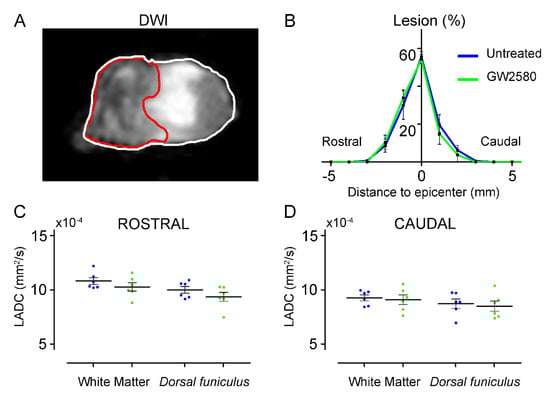 We next used ex vivo diffusion-weighted magnetic resonance imaging (DW-MRI) to analyze the effect of long-term GW2580 treatment on the lesion volume and the spinal cord microstructure. Using DW-MRI, we could clearly discriminate the lesion epicenter (Figure 2A, underlined in red) as well as the spared white and grey matters. Six weeks after SCI, the percentage of damaged tissue at the lesion epicenter, the rostro–caudal lesion extension, and the lesion volume (area under the curve 121.1+/−9.35 and 117.5+/−9.45 in the untreated and GW2580 treated mice, respectively) were similar in both groups (Figure 2B). Using luxol fast blue and toluidine blue staining, we further confirmed the absence of difference in lesion size between the two groups (data not shown). Then, we quantified longitudinal (Figure 2C,D) and transverse diffusivities on a 1.6 cm-spinal cord segment centered on the lesion site separately in the white matter (WM), excluding the dorsal funiculus (DF) and the DF. No differences were detected between groups in the longitudinal apparent diffusion coefficient (LADC) both rostral (Figure 2C) and caudal (Figure 2D) to the lesion.