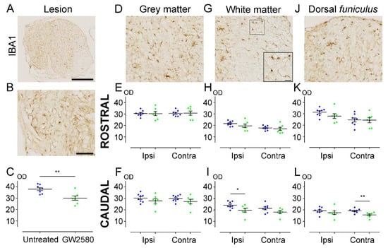 Long-term GW2580 treatment after SCI reduces IBA1 immunoreactivity in the injured spinal cord. Representative micrograph of IBA1 immuno-staining at the lesion epicenter (A). Zoomed-in micrographs in the lesion site (B), the grey matter (D), the white matter (G), and the dorsal funiculus (J) at the lesion epicenter. Six weeks after SCI, quantifications of IBA1 immunoreactivity were done in the lesion site (C), the grey matter (E,F), the white matter (H,I), and the dorsal funiculus (K,L). Optical densities were measured rostral (E,H,K) and caudal to the lesion site (F,I,L), ipsilateral, and contralateral to the lesion site. Results are expressed as mean ± SEM in untreated (blue) and GW2580-treated groups (green). Each dot corresponds to a minimum of 9 sections (630 µm interval between each section) analyzed per animal. Statistics: Student’s unpaired t-test. Number of mice: 8 for the untreated group and 7 for the GW2580-treated group. * p < 0.05; ** p < 0.01. scale bars: 500 µm (A); 100 µm (B,D,G,J); 20 µm (G) ( right bottom corner).