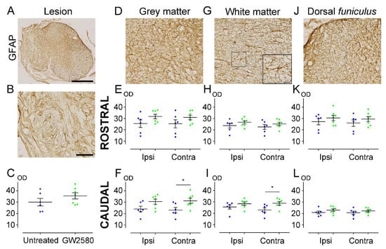 We next quantified astrocytic reactivity at 6 weeks after SCI on a 1.3 cm-perilesional segment of the spinal cord using GFAP (Figure 4A–L). We found a significant increase of GFAP expression on the contralateral side caudal to the lesion in both grey (GW2580-treated: 31.20 ± 2.298; untreated: 23.15 ± 2.314; p-value = 0.0320) (Figure 4F) and white (GW2580-treated: 28.76 ± 1.500; untreated: 22.93 ± 1.906; p-value = 0.0328) (Figure 4I) matters in the treated group in comparison with the control group. Contrariwise, astrocytic reactivity was similar in the two groups at the lesion site (Figure 4C), as well as rostral to the lesion in the GM (Figure 4E) and in the WM (Figure 4H). DF also showed no difference in GFAP reactivity between the two groups (Figure 4K,L). These data demonstrate that an increased astrocytic reactivity is induced caudal to the lesion upon prolonged GW2580 treatment 6 weeks after SCI.