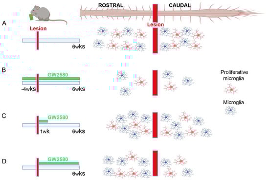 Here, we show that prolonged GW2580 treatment starting immediately after SCI has no impact on functional recovery. Contrariwise, we have previously shown that a continuous GW2580 treatment starting between 4 weeks prior to SCI and 6 weeks post-injury, (Figure 5B) improved fine motor outcomes in mice [10] compared to untreated animals (Figure 5A). Additionally, sustained inhibition of microglia proliferation pre- and post-SCI triggered reduced microgliosis 6 weeks after SCI (corresponding to the end of the treatment, Figure 5B) that may indicate long-term persistence of microglial proliferation after injury. GW2580 delivery prior to SCI is effective in inhibiting early microglia proliferation (just after SCI), converse to an oral-treatment initiated after the injury. Indeed, mice reduce their food intake at least for over 24 h following SCI. In a second study, we have shown that a short-term inhibition of microglia proliferation through GW2580 per os delivered during a 1-week post-SCI (Figure 5C) led to a better motor recovery and preservation of tissue structure [11]. Thus, post-lesion GW2580-induced improvements may reflect that microglial proliferation does not occur within the first few hours after injury. A previous report showed that the peak in microglia proliferation occurs at 1 week following T10/T11 spinal cord contusion in mice [6]. Following a 1-week GW2580 treatment starting immediately after SCI in mice, we observed an increased microgliosis six weeks post-lesion (i.e., five weeks after completion of the treatment, Figure 5C) [11]. It may represent either a compensatory response to the inhibition of microglia proliferation or a persistence of microglial proliferation long after injury. In the current study, we confirm that at the end of a long-term GW2580 treatment after injury, there is a reduced microgliosis (Figure 5D), again, speaking in favor of a persistent microglia proliferation after injury. However, the absence of an improved recovery points towards the importance of treatment duration.