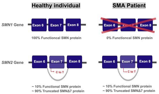 Genetics of spinal muscular atrophy (SMA). The SMN1 gene produces 100% full-length functional protein. The homologous SMN2 gene produces about 10% of full-length functional SMN protein and 90% of a truncated and rapidly degraded SMNΔ7 protein, due to a C to T substitution in exon 7. Healthy individuals retain copies of both SMN1 and SMN2 while SMA patients have a loss of SMN1 due to mutations and/or deletions.