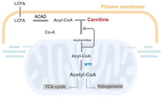 Schematic diagram of mitochondrial fatty acid entry and beta oxidation. Long chain fatty acid (LCFA) is activated by bonding with CoA upon cell entry. Acyl-CoA dehydrogenase (ACAD) catalyzes this first reaction. This molecule, now an acyl-CoA, is shuttled through the mitochondrial membrane by forming an ester bond with carnitine, thus generating acylcarnitine. Once inside the mitochondria, acylcarnitine is broken down to produce free carnitine, which can be recycled to shuttle in further fatty acids in the mitochondria. The long chain acyl-CoA generated is then oxidised to produce acetyl-CoA, a process catalysed by mitochondrial trifunctional protein (MTP). Acetyl-CoA can be utilised in the tricarboxylic acid cycle (TCA) cycle or participate in ketogenesis.