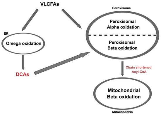 Schematic diagram of alpha and omega oxidation. Very long chain fatty acids (VLCFAs) either go through peroxisomal alpha oxidation or omega oxidation in the endoplasmic reticulum (ER). The latter produces dicarboxylic acids (DCAs) that undergo peroxisomal beta oxidation, produce shortened acyl-CoAs that then go through mitochondrial beta oxidation.