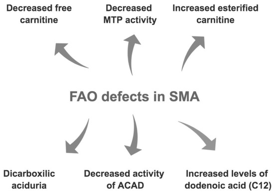 Summary of fatty acid oxidation (FAO) defects in SMA. Mitochondrial trifunctional protein (MTP), acyl carnitine dehydrogenase (ACAD).