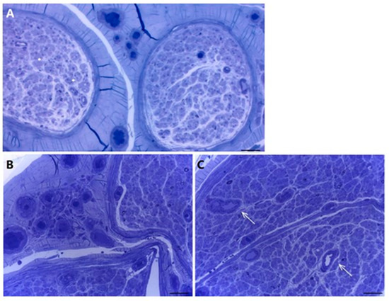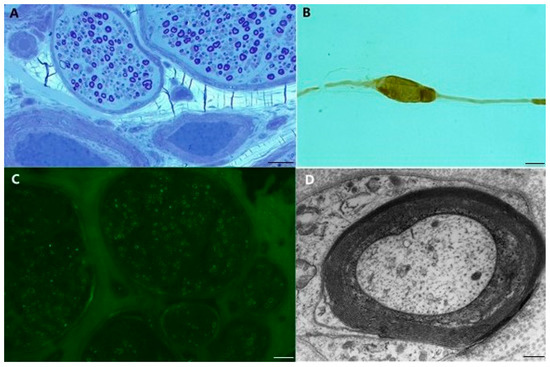 In hematological diseases, sural nerve biopsy remains the gold standard for the diagnosis of vasculitis, neurolymphomatosis, and light chain amyloidosis. Whole sural nerve biopsy is required to assess these pathologies frequently characterized by epineurial lesions and are processed according to routine procedures [4]. Besides its diagnostic role, sural nerve biopsy has helped understand the pathogenesis of several neuropathies, first of all, the most common immune-mediated neuropathy, that is the neuropathy with antibodies to the myelin-associated glycoprotein (anti-MAG neuropathy).