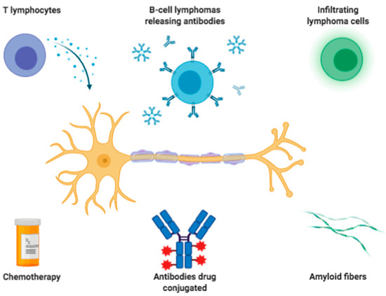 The immune checkpoint inhibitors (i.e., nivolumab and pembrolizumab), approved for relapsed/refractory Hodgkin’s lymphomas, act by targeting programmed cell death protein 1 (PD-1), a cell surface receptor with a crucial modulatory role on the immune system. Given their more recent introduction among the therapeutic options for hematological disorders, the incidence, clinical characteristics, and timing of possible iatrogenic peripheral neuropathy are still being defined [93,94]. However, a recent paper by Psimaras et al. showed that these drugs are considered relatively safe with regards to peripheral nerve involvement with a reported overall incidence of around 1.2–1.3% [95]. An immune-mediated demyelinating polyradiculoneuropathy has been reported in some patients undergoing treatment with immune checkpoint inhibitors but epidemiological data are still unreliable due to significant differences across studies. To date, few pathological studies have been performed on these patients, with evidence of epineurial perivascular inflammatory deposits (T lymphocytes) [96,97].