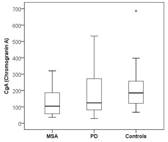 Interestingly, there was not a case of strongly elevated CSF CgA levels in MSA as there was in PD. This may be due to the smaller number of MSA patients or by a different pathophysiology of these two diseases.