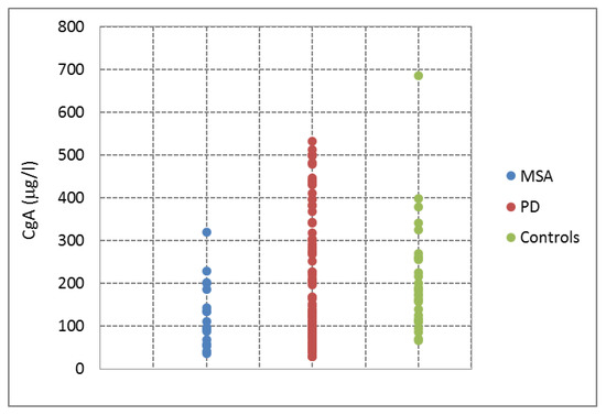 In our previous work, we found lower levels of CSF CgA in patients with early-stage PD [7,8]. CSF CgA levels were lower in PD patients with orthostatic hypotension (OH) compared to patients without OH [7]. The limitation of these studies was the small sample of patients. In the present study, we extended the sample of PD patients in whom we measured CSF CgA. We also measured CSF CgA in multiple system atrophy (MSA) patients, as MSA is characterized by severe orthostatic hypotension.