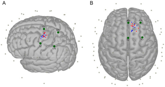 For TMS, a monophasic stimulus was delivered through a 70-mm figure-of-eight coil connected to a Magpro X100 magnetic stimulator (MagVenture, Farum, Denmark), with the handle backwards at 45° to the midline, inducing current in the posterior-anterior direction [12]. To obtain the M1 “hot spot”, the coil was systematically changed in position until the largest motor evoked potential (MEP) was obtained in the contralateral first dorsal interosseous (FDI) muscle, as commonly done for TMS investigations involving M1 [13,14] (Figure 1). For the mPFC, the stimulation point approximately corresponded to the right superior frontal gyrus (Figure 1), with the coil handle pointing posteriorly.