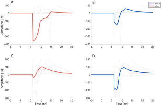 Illustration of grand-averaged electroencephalographic (EEG) artefact caused by direct scalp muscle activation by TMS on M1 (A,B) and mPFC (C,D). Red lines represent AE recordings, while blue lines refer to PE recordings. Light grey lines indicate are individual subjects’ traces. Signals were cut before 7 ms to eliminate the artefact due the TMS pulse itself and residual current decay. M1 artefact was recorded from FT7, while for mPFC FP2 electrode was chosen, according to the topography of the maximal amplitude of the EMG.