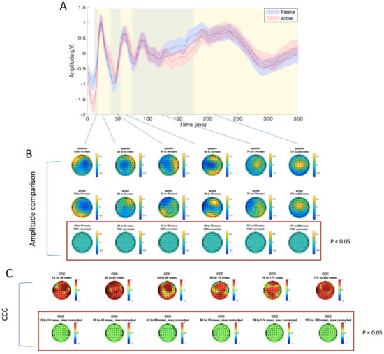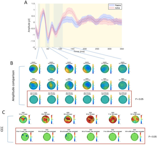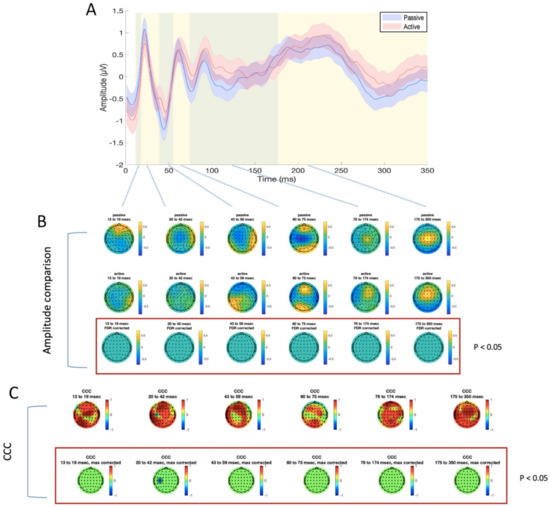 Differences and similarities between PE and AE sessions in the M1 ISICA condition. (A) transcranial evoked potential (TEP) averaged in the four electrodes surrounding the stimulation site (C1, C3, CP1, CP3), for passive (blue line) and active (red line) electrodes. Shaded areas indicate the standard error of the mean; green and yellow panels refer to the time windows of interest which were used for amplitude comparison and concordance correlation coefficient (CCC). (B) amplitude comparison between the signals obtained with PE (upper row) and AE (middle row). No statistically significant differences were found (lower row). (C) CCC analysis (raw CCC values are illustrated in the upper row, while statistically corrected values are visualized in the lower row). Only a few electrodes showed significantly lower CCC than expected.