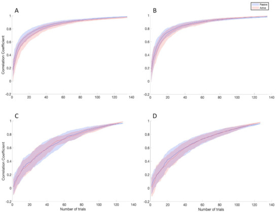 Efficiency comparison between PE (blue lines) and AE (red lines) for M1 ISICA (A), M1 SSICA (B), mPFC ISICA (C), and mPFC SSICA (D) conditions. The shaded areas indicate the standard error of the mean. No statistically significant differences were observed in all the conditions tested (see text for details).