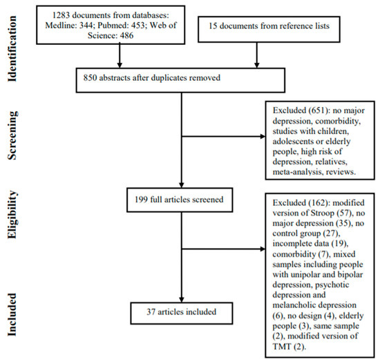 Articles were excluded according to the following criteria: (a) participants with comorbid disorders, substance use, substance abuse, major depression with psychotic symptoms, bipolar depression, and major depression related to medical illnesses; (b) studies in children, adolescents, or elderly people; (c) studies involving people with high risk of depression or relatives of people with MD; and (d) studies using a modified version of the TMT and/or Stroop test. Meta-analyses and reviews were also excluded because their individual studies and references were inspected and assessed for inclusion in the previous step.