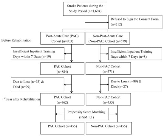 The study population included all patients who had undergone stroke (defined as ICD-9-CM-codes: 433.x, 434.x, and 436.x for ischemic stroke; 430 and 431 for hemorrhagic stroke) admission to a PAC ward at two medical centers and a non-PAC ward at three regional hospitals and one district hospital in south Taiwan between March 2014 and October 2018. The patients should meet the criteria including acute stroke, stroke onset day within 30 days, and Modified Rankin Scale (MRS) scores of 2 to 4, where MRS scores of 0, 1, 2, 3, 4, and 5 are interpreted as no symptoms, no significant disability, slight disability, moderate disability, moderately severe disability, and severe disability, respectively [12].