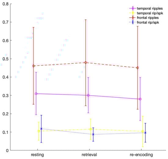Mean ripple and ripple-on-spike (rip/spk) rates per second during the three conditions for frontal and temporal regions, relative to the conditions’ duration and each patients’ number of channels. Error bars represent 95%-confidence intervals.