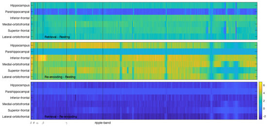 Figure 2 shows the test statistics for these comparisons, revealing no noticeable trends of differences between the power density spectra. Statistical significance testing concurred with this observation. Interestingly, the results suggest that parahippocampal regions are not greatly involved in the retrieval phase of the spatial navigation task. However, only one-third of the patients had electrodes implanted within this region. Furthermore, power spectra suggest higher task-involvement of all regions of interest during re-encoding than during retrieval when compared to the resting period.