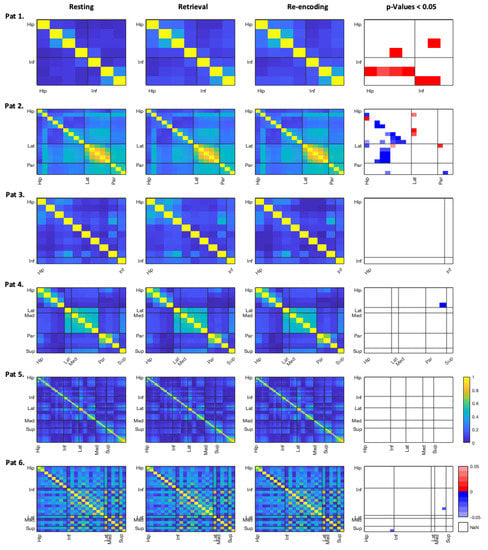 Coherences for patients 1–6 within the ripple band. Absolute coherence values in channel x channel matrices for both experimental conditions, as well as resting, are displayed (columns 1–3). Column 4 shows the respective contrasts between retrieval versus resting in the bottom left triangle under the diagonal, and re-encoding versus rest in the upper right triangle. Red (positive) p-values represent higher connectivity in the experimental condition, and blue (negative) values represent higher connectivity during the resting. Brain regions of interest are abbreviated as follows: Hip = hippocampus, Inf = inferior-frontal, Lat = lateral-orbitofrontal, Med = medial-orbitofrontal, Par = parahippocampus, Sup = superior-frontal.