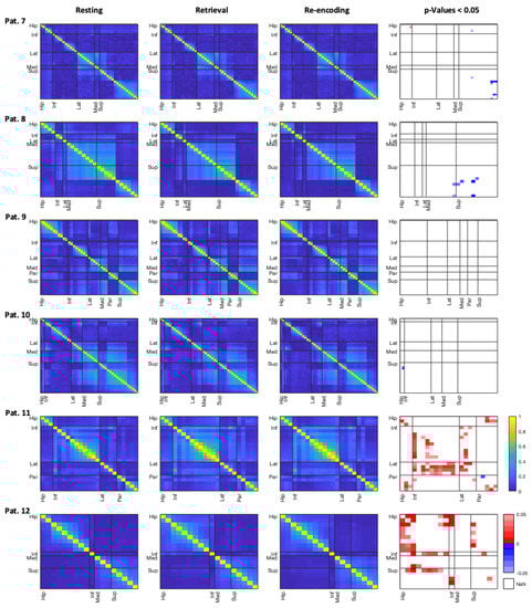 Coherences for patients 7–12 within the ripple band. Absolute coherence values in channel x channel matrices for both experimental conditions, as well as resting, are displayed (columns 1–3). Column 4 shows the respective contrasts between retrieval versus resting in the bottom left triangle under the diagonal, and re-encoding versus rest in the upper right triangle. Red (positive) p-values represent higher connectivity in the experimental condition, and blue (negative) values represent higher connectivity during the resting. Brain regions of interest are abbreviated as follows: Hip = hippocampus, Inf = inferior-frontal, Lat = lateral-orbitofrontal, Med = medial-orbitofrontal, Par = parahippocampus, Sup = superior-frontal.