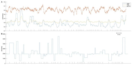 Coherences for patient 9 over the entire recording of 70.57 min within the gamma, theta, and ripple-band. Coherences between channels of the medial-orbitofrontal and the superior-frontal cortex are displayed at the top (A). One data point corresponds to a shift of one second, with each coherence value stemming from a moving window of 47 s. At the bottom (B), the drop error is depicted for all retrieval trials. Ticks on the abscissa are based on the beginning of each retrieval and re-encoding trial.