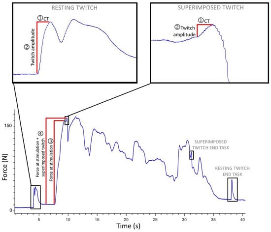 Data processing was performed using Spike2 software (CED, Cambridge, UK) and Microsoft Excel software (version 16.35, Microsoft Corporation, Redmond, WA, US). The peak amplitude of the three brief MVCs [53] was measured in Spike2, and the mean was calculated in Microsoft Excel. In Spike2, for the 30-s MVC task, the resting and superimposed muscle twitches in the force data were identified visually and the following parameters were extracted (see Figure 2): (1) twitch contraction time (CT), (2) twitch peak to peak amplitude, (3) amplitude of the MVC just prior to the delivery of superimposed twitches (force at stimulation), and (4) total force produced by the MVC plus the superimposed twitches (force at stimulation + superimposed twitch). If there was any uncertainty about the onset of the twitch or its duration, the assessor considered the biologically feasible twitch duration and latency [4,19,54], to ensure the twitch was measured, and not any pre- or post-twitch muscle activity. This occurred on occasion when there was a voluntary contraction or involuntary muscle spasm immediately following the resting muscle twitch, resulting in a second visible twitch on the force data. In the case where the interpolated twitch was delivered over a rising or descending force signal and the twitch onset was unclear, the conduction time (from EMG artefact to twitch onset) of another twitch for that participant was used to define the twitch onset.
