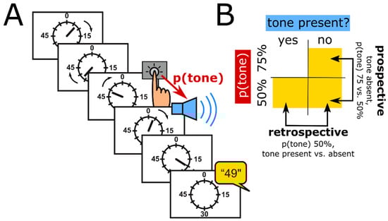 Finally, Moore and Haggard’s [50] operationalization of prospective binding remains potentially confounded. The effect labelled as “prospective binding” relies on differences between conditions in predictability of a tone, established via context (Figure 1A). Specifically, keypresses are followed by a tone more frequently in one condition than in the other, so that expectation of a tone is higher. However, expectation may influence action binding retrospectively, i.e., after the action has occurred. For example, when an expected tone is unexpectedly omitted, there is an omission response at the time at which that tone was expected (e.g., Sanmiguel et al. [73]), which could drive the “prospective” component of intentional binding.