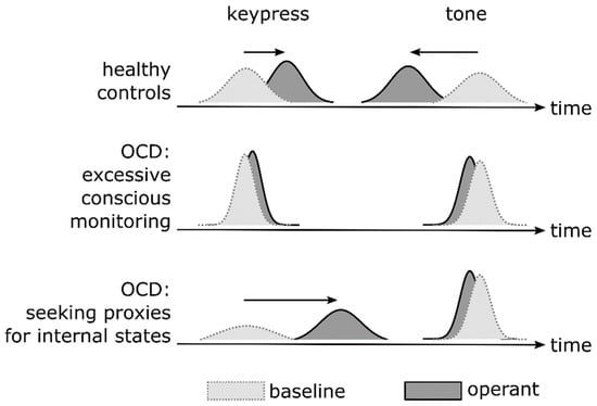 We argue that a classic psychophysical test exists that provides this implicit operationalization. This test is the intentional binding paradigm introduced by Haggard et al. [7]. Moreover, we show that intentional binding can pit two ideas that are fundamental to current sensorimotor theories of compulsion against each other. These are the idea of excessive conscious monitoring of action in OCD [8,9,10,11] and the idea that patients with OCD compensate for diminished conscious access to “internal states”, including states of the body, by relying on more readily observable proxies [8,12]. These ideas make distinct predictions regarding the cause of an altered experience of action and agency in OCD, and ultimately differ in their implications for therapeutic approaches. We show that intentional binding provides an opportunity to test these predictions, and a useful window onto an altered subjective experience of action and agency in OCD. While some aspects of intentional binding have been tested in a non-clinical population of healthy volunteers, divided into subgroups with relatively high vs. low obsessive–compulsive tendencies [13], the full potential of intentional binding to discriminate between ideas that are fundamental to current theories of OCD has remained unexploited.