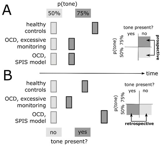 Thirdly, intentional binding is a compound phenomenon whose component processes are highly relevant to the sensorimotor theories of compulsion reviewed above. Specifically, there are predictive as well as retrospective contributions to the action binding component of intentional binding [50,51]. Moore and Haggard [50], for example, found that the perceived time of a keypress was shifted forward when participants expected a tone presented with high probability, compared to a condition in which the tone was presented with relatively low probability, and therefore less expected. This forward shift of the perceived time of action occurred irrespective of whether a tone was eventually presented or not, providing evidence for a predictive, possibly prospective, component of action binding (Figure 1B, “prospective”). However, presence vs. absence of a tone did change the perceived timing of the preceding keypress in the condition in which tones were presented with relatively low probability. Specifically, presence, compared to absence, of the tone shifted the perceived timing of the preceding keypress forward. Because the tone was presented, or omitted, only after the keypress had already been executed, this forward shift can be interpreted as evidence for a retrospective component of action binding (Figure 1B, “retrospective”). Altered function of predictive internal models in OCD, as proposed by Gentsch et al. [40], may be expected to impact on the predictive component of binding, e.g., manifest as reduced predictive (prospective) binding. An over-reliance on observable “proxies” for “internal states”, as in the SPIS model, on the other hand, may be expected to enhance retrospective action binding (see next section).