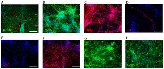 Immunocytochemical staining of human iPSC-derived neuron culture. (A) β3 tubulin (green), (B) MAP2 (green), (C) NSE (red), (D) TH (red), (E) GFAP (red), (F) DARPP-32 (red), (G) GABARa (green), and (H) GABARb (green). All images include DAPI staining (blue). Scale bar for all images is 100 μm.