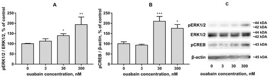 The effects of 4 h culture incubation with 3 nM, 30 nM, and 300 nM ouabain on ERK1/2 (A) and CREB (B) activation. Data is presented as percent mean ± SEM, where intact culture values are taken as 100%. n = 6. Representative immunoreactive bands (C). * p < 0.05, ** p < 0.01, *** p < 0.001.